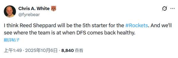 在谈到这个话题的时候,火箭记者Chris A. White表示:“我认为谢泼德会是火箭队的第五位首发球员。等芬尼-史密斯健康归来之后,我们再看看球队的具体情况。”